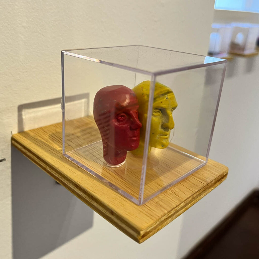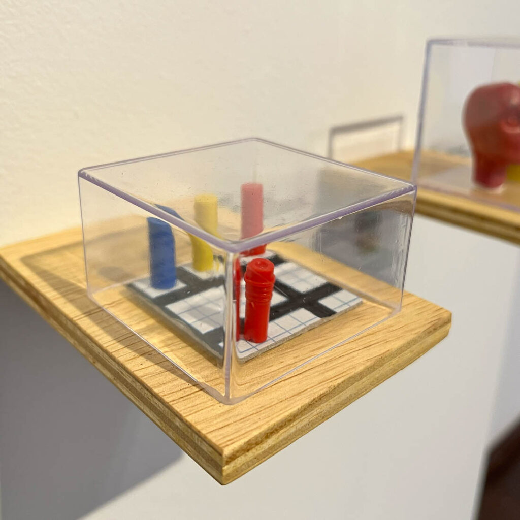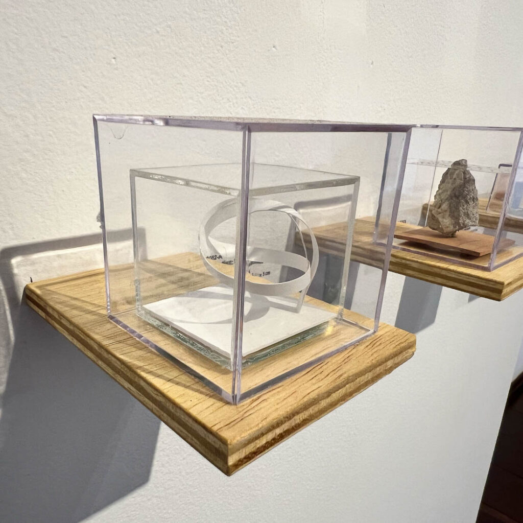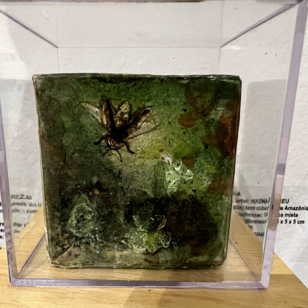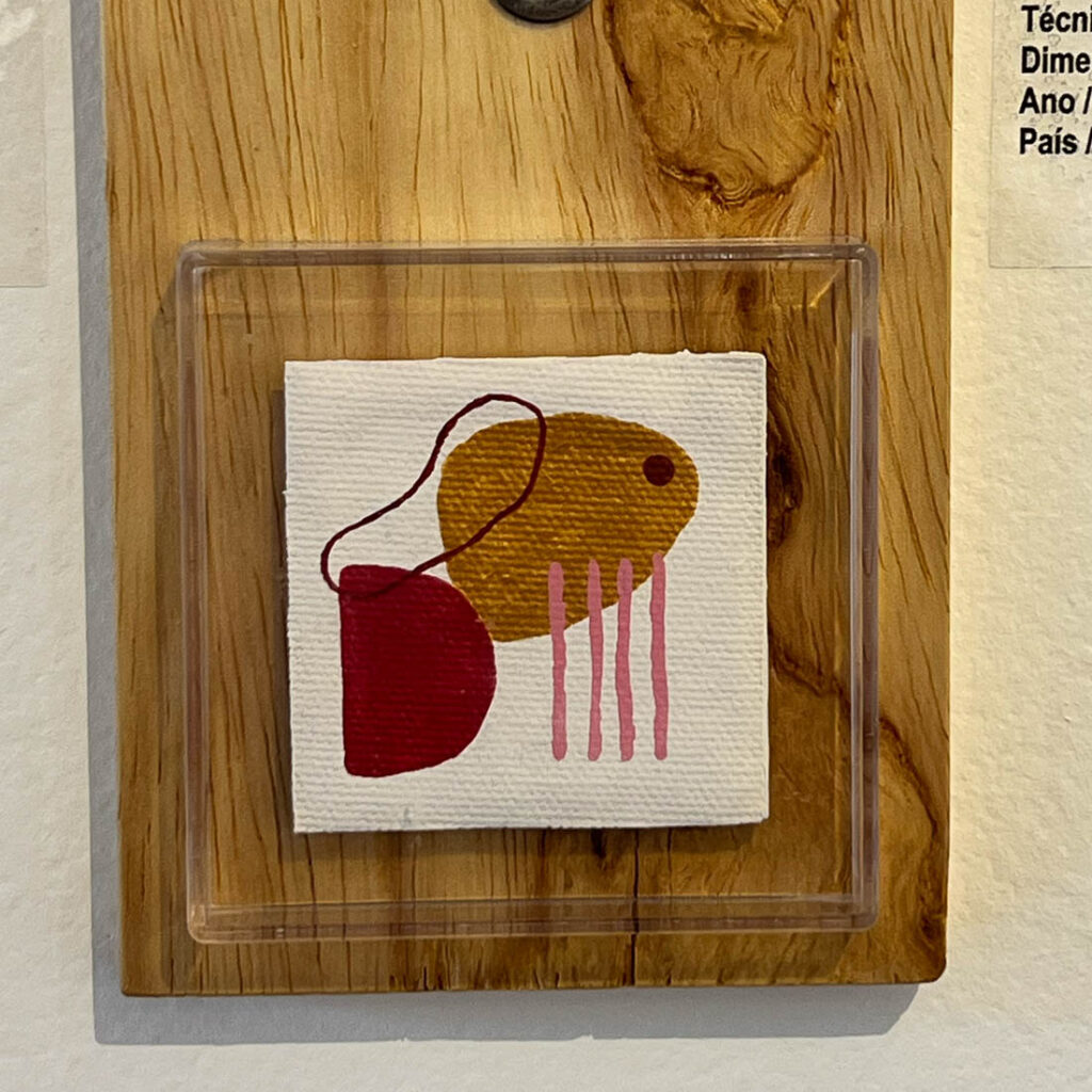 NR 0045-A Artista / artist: RICARDO ALVES Título / title: Camaleão Técnica / technique: Óleo sobre papel cartão Dimensões / dimensions: 5 x 5 cm Ano / year: 2020 País / country: BRASILNR 0046-A Artista / artist MATHEUS GUILHERME Título / title: Autorretrato com três jaquetas diferentes, três dias diferentes Técnica / technique: Acrílico sobre tela Dimensões / dimensions: 5 x 3,5 cm Ano / year: 2020 País / country: BRASILNR 0048-A Artista / artist: RAFAEL KENJI Título / title: Concha de Levy Técnica / technique: Gravura em metal Dimensões / dimensions: 5 x 5 x cm Ano / year: 2020 País / country: BRASILNR 0049-A Artista / artist: MARIA QUEIROGA Título / title: Sem título l (da série Poesia Simbólica) Técnica / technique: Acrilica sobre lona Dimensões / dimensions: 5 x 5 cm Ano / year: 2020 País / country: BRASILNR 0050-A Artista / artist RAFAEL ALONSO Título / title: “O de cima e o de baixo” Técnica / technique: Acrílica sobre papel Dimensões / dimensions: 4 x 4 cm Ano / year: 2021 País / country: BRASILNR 0051-A Artista / artist: KEYT MENDONÇA Título / title: Sem Título l – (da série: Das Montanhas apenas o pedaço que finaliza o abismo) Técnica / technique: Nanquim sobre papel Dimensões / dimensions: 5 x 5 cm Ano / year: 2020 País / country: BRASILNR 0082-A Artista / artist: RENATO LEAL Título / title: Micro Organicidades 1 Técnica / technique: Papel Dimensões / dimensions: 5 x 5 x 5 cm Ano / year: 2020 País / country: BRASILNR 0083-A Artista / artist: LEANDRO DA COSTA Título / title: Icebergs – Estar a deriva é uma questão de escala Técnica / technique: Madeira, pedra, namquim sobre acetato, parafuso e massa plástica Dimensões / dimensions: 5 x 5 x 5 cm Ano / year: 2020 País / country: BRASILNR 0084-A Artista / artist: DIOGO BUENO Título / title: Como aqui é muito quente e eles não têm lazer, atravessaram o campinho e foram nadar na caixa d’água Técnica / technique: Papelão, papel quadriculado, tampas de caneta, pregos, hidrocor e cola bastão Dimensões / dimensions: 5 x 5 x 5 cm Ano / year: 2020 País / country: BRASILNR 0085-A Artista / artist: TANGERINA BRUNO Título / title: Para dar forma é preciso tirar a forma – Autoretrato Técnica / technique: Escultura em giz de cera Dimensões / dimensions: 5 x 3,5 x 5 cm Ano / year: 2020 País / country: BRASILNR 0088-A Artista / artist: GUSTAVO TORREZAN Título / title: Como inventar novos céus com as mesmas estrelas (série exercício cosmopolítico l) Técnica / technique: Estrelas de plástico, cúpula de pleastico, anel e corrente de aço Dimensões / dimensions: 5 x 5 x 5 cm Ano / year: 2020 País / country: BRASILNR 0090-A Artista / artist: HADNA ABREU Título / title: 5cm cúbicos de Amazônia Técnica / technique: Técnica mista Dimensões / dimensions: 5 x 5 x 5 cm Ano / year: 2020 País / country: BRASIL